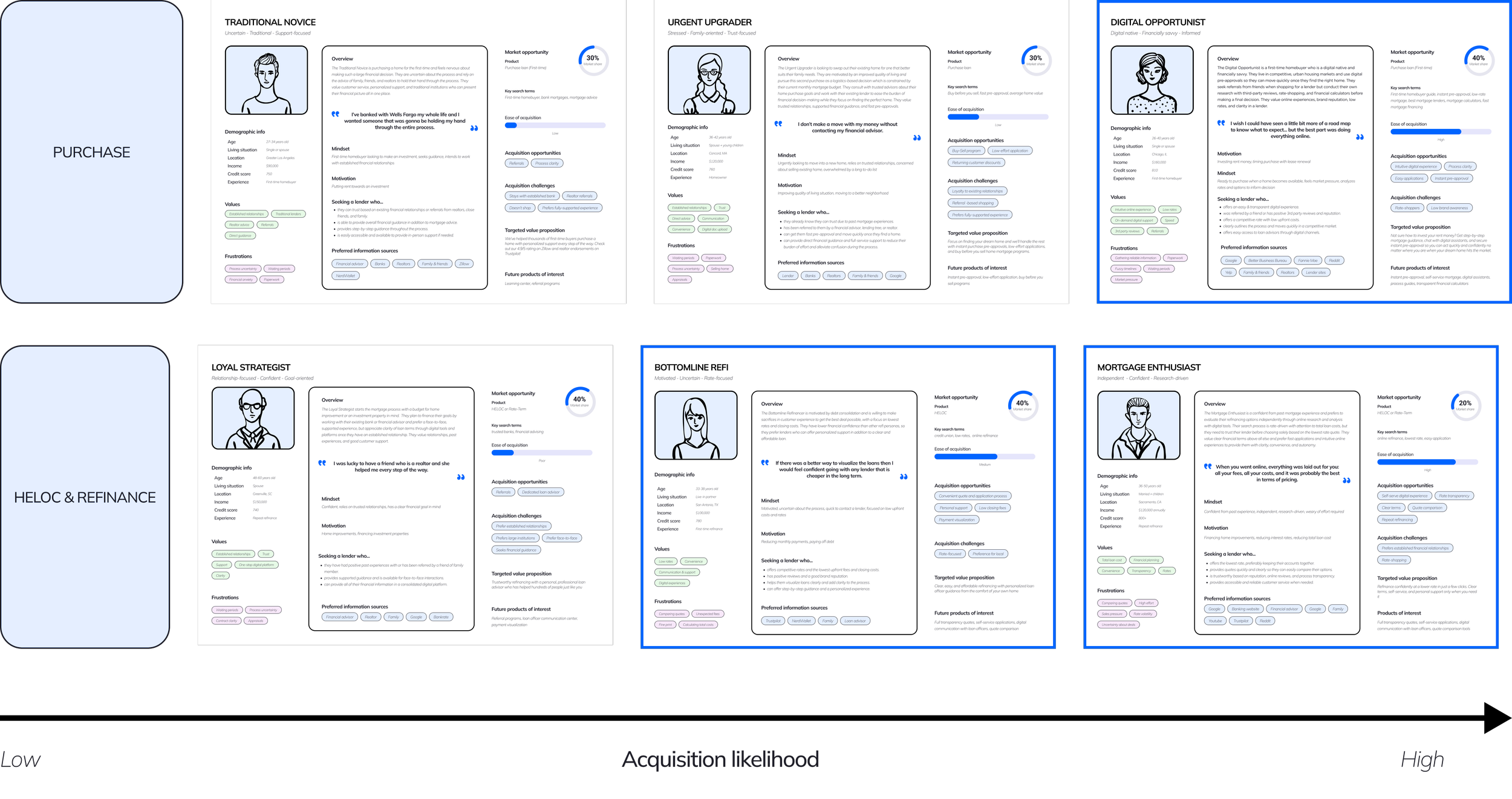 Based on clustering data, I identified 3 personas for home purchases and 3 for HELOC (Home Equity Line of Credit) and refinance. Of these personas, Lower.com’s highest acquisition likelihood was with the Digital Opportunist, Bottomline Refi, and Mortgage Enthusiast personas due to their openness to a digital experience and preference for quick, opportunistic transactions.